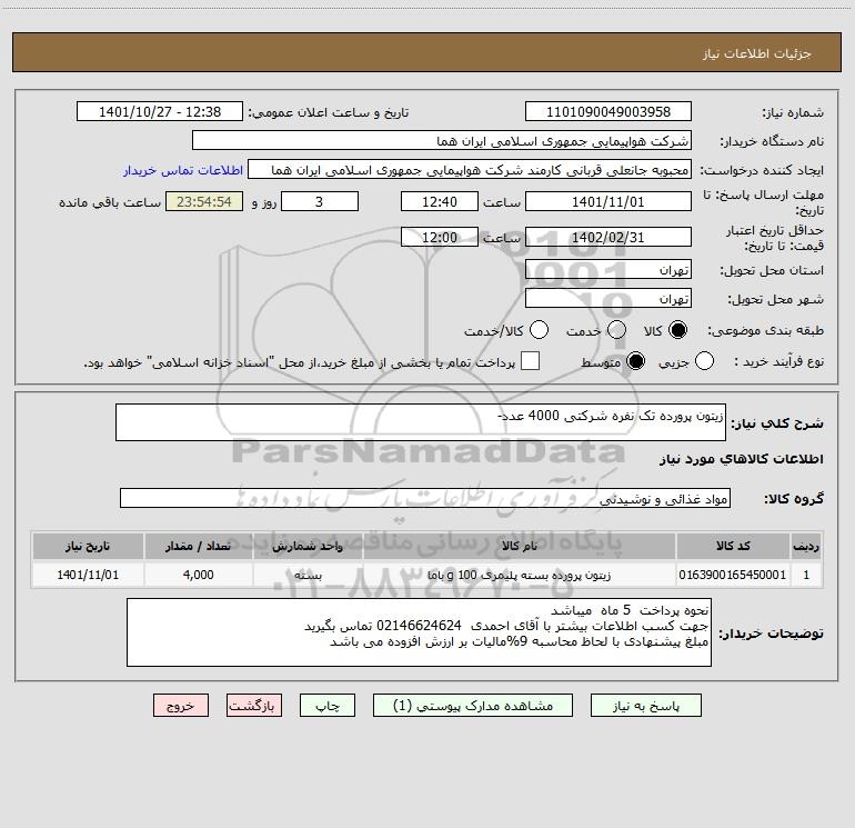 شرح کلی نیاز: زیتون پرورده تک نفره شرکتی 4000 عدد-