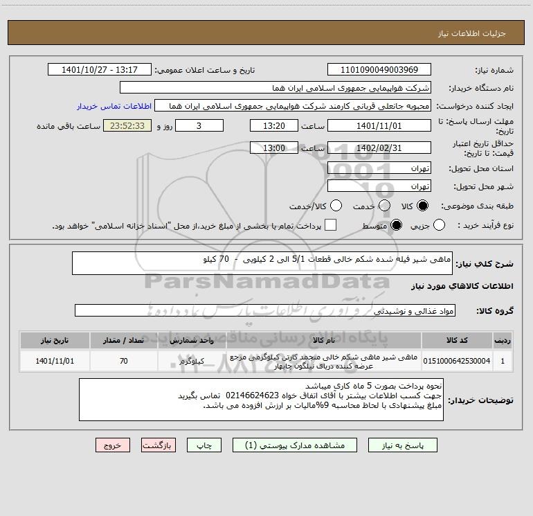 شرح کلی نیاز: ماهی شیر فیله شده شکم خالی قطعات 5/1 الی 2 کیلویی - 70 کیلو
