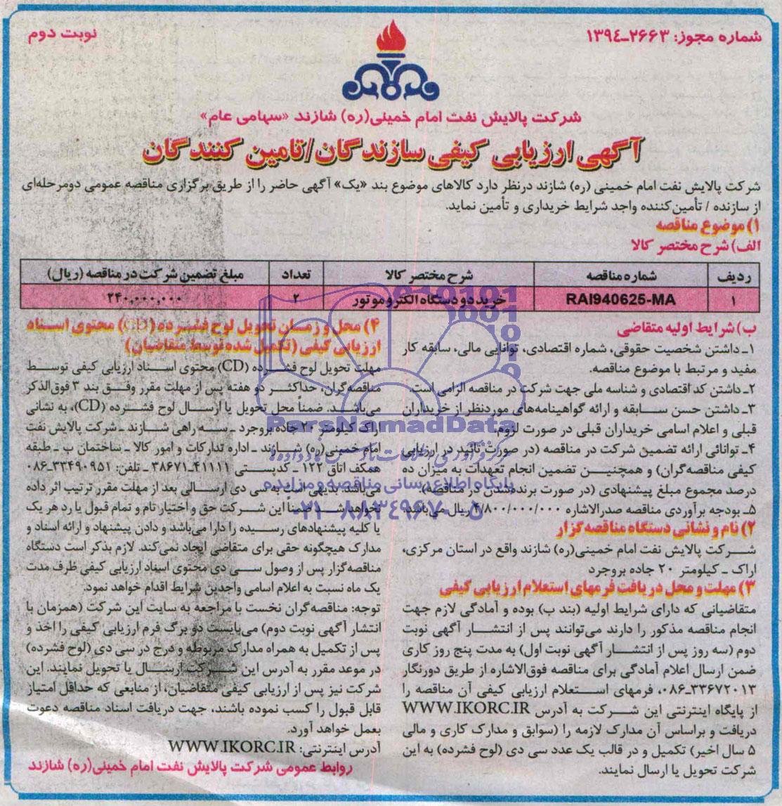 مناقصه خرید دو دستگاه الکتروموتور از کلیه افراد متخصص و شرکتها واجد شرایط دعوت به عمل میآید در مناقصه با کد خبرگزاری پارس نماد: 540499 شرکت نمایند.