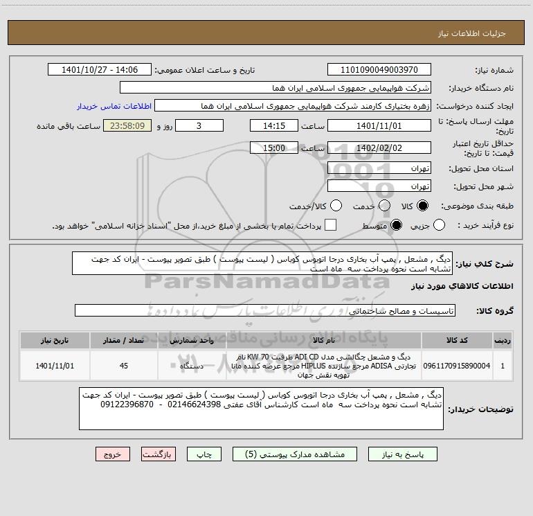شرح کلی نیاز: دیگ , مشعل , پمپ آب بخاری درجا اتوبوس کوباس ( لیست پیوست ) طبق تصویر پیوست - ایران کد جهت تشابه است نحوه پرداخت سه ماه است