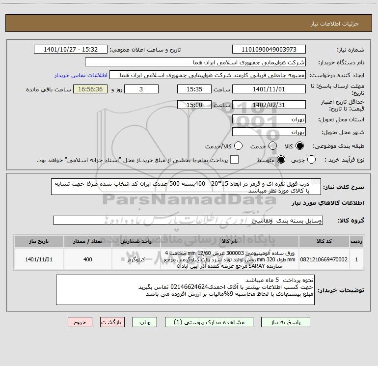 شرح کلی نیاز: درب فویل نقره ای و قرمز در ابعاد 15*20 - 400بسته 500 عددی ایران کد انتخاب شده صرفا جهت تشابه با کالای مورد نظر میباشد