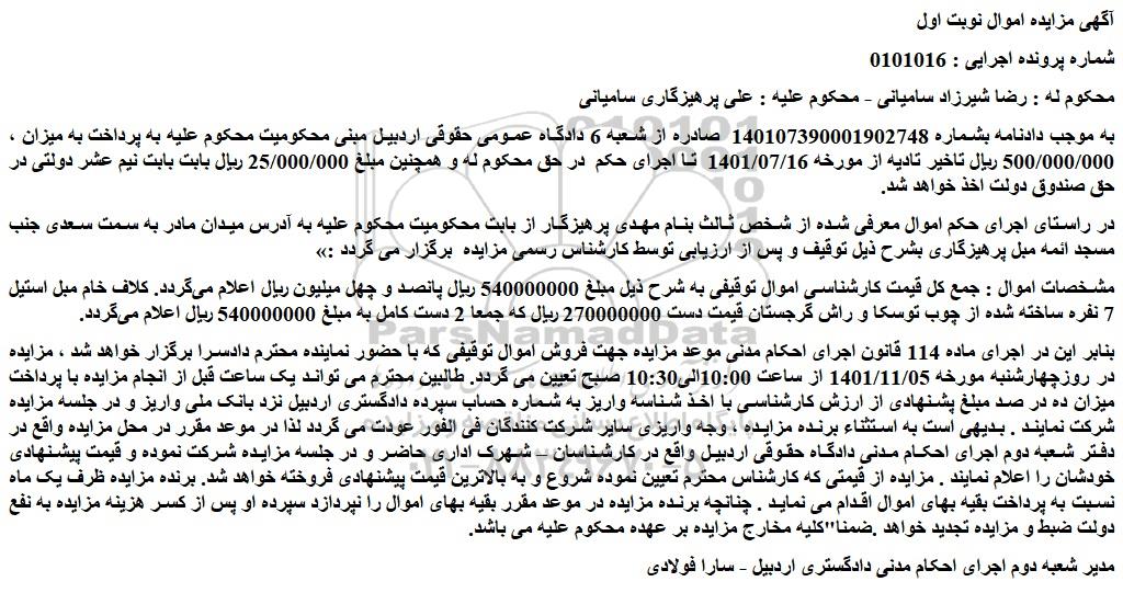 ، به موجب دادنامه بشماره 140107390001902748  صادره از شعبه 6 دادگاه عمومی حقوقی اردبیل مبنی محکومیت محکوم علیه به پرداخت به میزان 500/000/000 ریال تاخیر تادیه از مورخه 1401/07/16  تا اجرای حکم  در حق محکوم له و همچنین مبلغ 25/000/000 ریال بابت بابت نیم عشر دولتی در حق صندوق دولت اخذ خواهد شد.