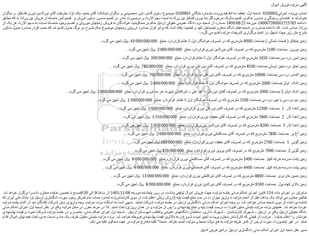شماره پرونده اجرایی0100903  شعبه اول :عطف به ابلاغیه پرونده بشماره بایگانی 0100903 موضوع دعوی آقای داور معصومی و دیگران باوکالت آقای حمید پاک نژاد بطرفیت آقای نورالدین نوری قشلاق  و دیگران بخواسته «  تقاضای رسیدگی و صدور حکم بر تقسیم ماترک مرحوم گل بابا نوری قشلاق بین ورثه به نسبت سهم الارث و درصورت تعذر در تقسیم صدور دستور فروش و  تقسیم ثمن حاصله از فروش بین وراث » که مطابق دادنامه 140007390001753763 مورخه 1400/06/25 صادره از شعبه دوم دادگاه عمومی حقوقی اردبیل حکم بر محکومیت خواندگان به فروش زمینهای موروثی و تقسیم وجوه حاصله نسبت به سهم الارث هر یک از وراث صادر شده  که دادنامه صادره در شعبه هفتم دادگاه محترم تجدیدنظر تایید و قطعیت یافته است که برابر قرار صادره ارزیابی زمینهای موضوع حکم بشرح دو برگ جدول تقدیم شد که حسب قرار صادره جدول مذکور بشرح متن زیر جهت تسهیل در انجام برگزاری تشریفات مزایده تقدیم می گردد :