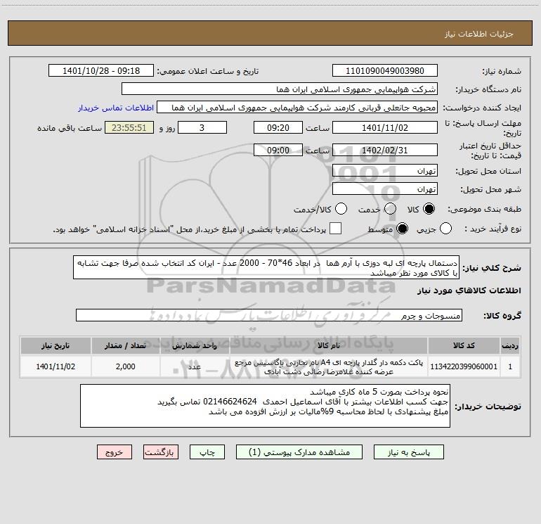 شرح کلی نیاز: دستمال پارچه ای لبه دوزی با آرم هما در ابعاد 46*70 - 2000 عدد - ایران کد انتخاب شده صرفا جهت تشابه با کالای مورد نظر میباشد