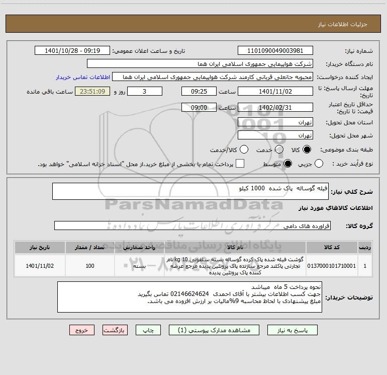 شرح کلی نیاز: فیله گوساله پاک شده 1000 کیلو