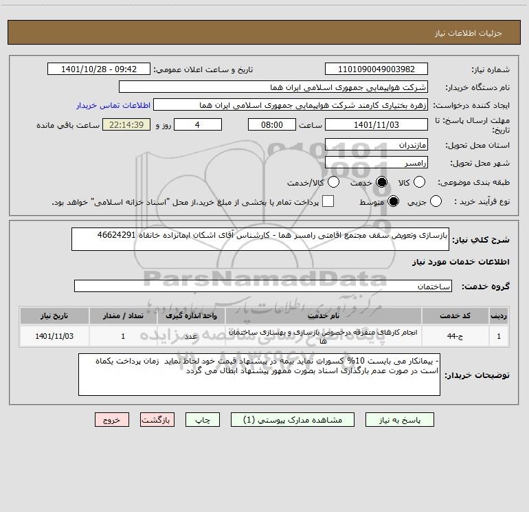 شرح کلی نیاز: بازسازی وتعویض سقف مجتمع اقامتی رامسر هما - کارشناس آقای اشکان ایمانزاده خانقاه 46624291