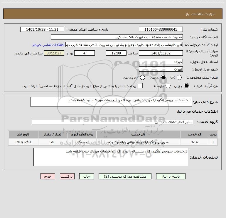 شرح کلی نیاز: 1.خدمات سرویس/نگهداری و پشتیبانی دوره ای و 2.خدمات موردی بدون قطعه بابت