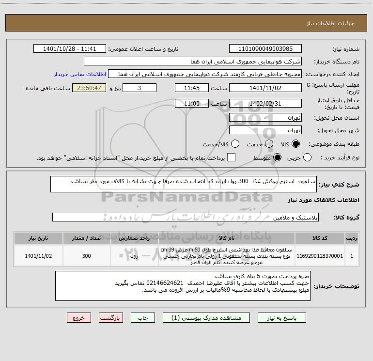 شرح کلی نیاز: سلفون استرج روکش غذا 300 رول ایران کد انتخاب شده صرفا جهت تشابه با کالای مورد نظر میباشد