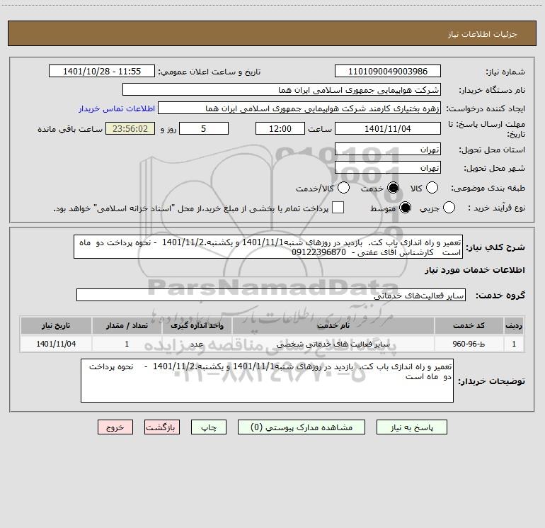 شرح کلی نیاز: تعمیر و راه اندازی باب کت. بازدید در روزهای شنبه1401/11/1 و یکشنبه.1401/11/2 - نحوه پرداخت دو ماه است کارشناس آقای عفتی - 09122396870