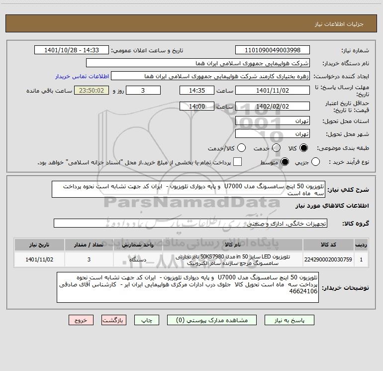 شرح کلی نیاز: تلویزیون 50 اینچ سامسونگ مدل U7000 و پایه دیواری تلویزیون - ایران کد جهت تشابه است نحوه پرداخت سه ماه است