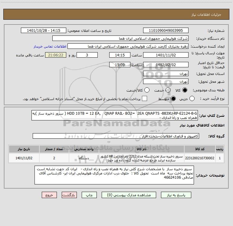 شرح کلی نیاز: HDD 10TB = 12 EA, QNAP RAIL- BO2= 2EA QNAPTS -883XU-RP-E2124-8-G ( سرور ذخیره ساز )به همراه نصب و راه اندازی -