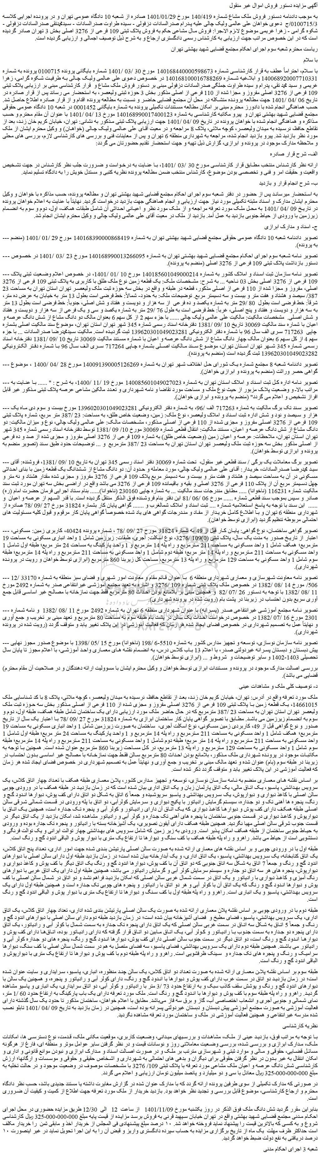به موجب دادنامه دستور فروش ملک مشاع شماره 140/419 مورخ 1401/01/29 صادره از شعبه 10 دادگاه عمومی تهران و در پرونده اجرایی کلاسه 0100715/3/ج دعوی خواهان علی عالمی ولیک چالی علیه پدرام صدرالسادات دزفولی - سیده طراوت صدرالسادات - سیدمحمدتقی صدرالسادات دزفولی - شکوه گرامی - زهرا غریمی موضوع لازم الاجرا: فروش مال مشاعی حکم به فروش پلاک ثبتی 109 فرعی از 3276 اصلی بخش 3 تهران صادر گردیده است که در این خصوص مراتب جهت ارزیابی به کارشناس رسمی دادگستری ارجاع و به شرح ذیل توصیف اجمالی و ارزیابی گردیده است.