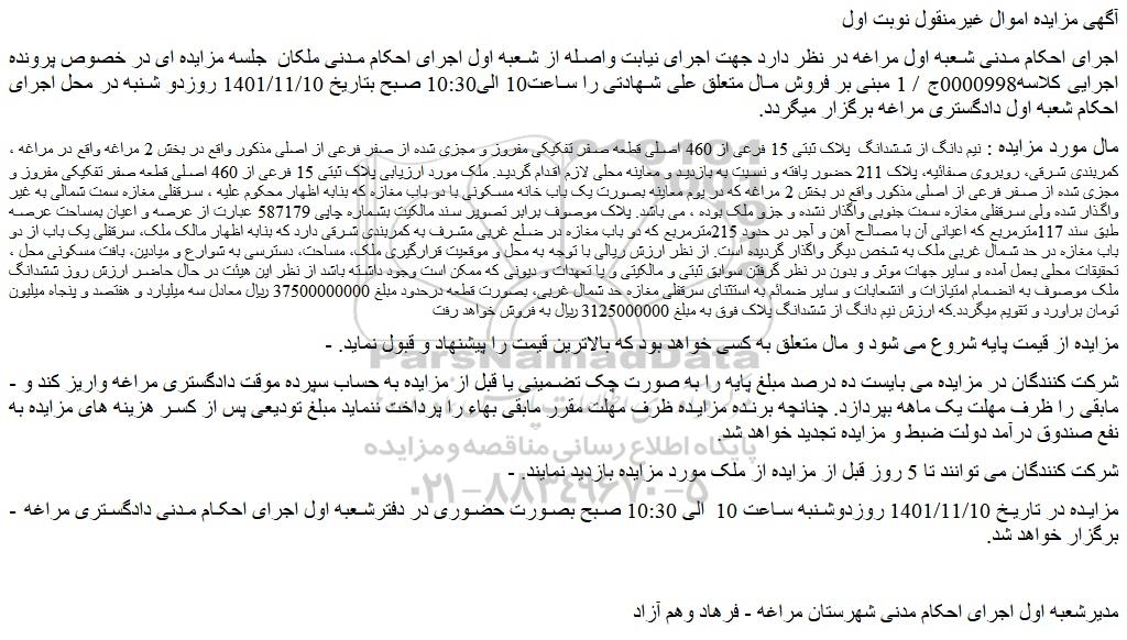 اجرای احکام مدنی شعبه اول مراغه در نظر دارد جهت اجرای نیابت واصله از شعبه اول اجرای احکام مدنی ملکان جلسه مزایده ای در خصوص پرونده اجرایی کلاسه0000998ج / 1 مبنی بر فروش مال متعلق علی شهادتی را ساعت10 الی10:30 صبح بتاریخ 1401/11/10 روزدو شنبه در محل اجرای احکام شعبه اول دادگستری مراغه برگزار میگردد.