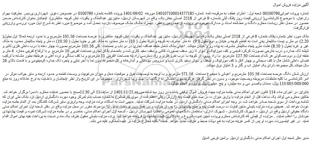 شماره پرونده اجرایی00100790 شعبه اول : احترام عطف به مرقومه نامه شماره 140107100014377185 مورخه 1401/09/02 پرونده کلاسه بشماره 0100790 در خصوص دعوی شهرداری پردیس بطرفیت بهرام زارعیان، با موضوع کارشناسی( ارزیابی قیمت روز پلاک ثبتی بشماره 9 فرعی از 2518 اصلی بخش یک، واقع در شهرستان اردبیل- مابین پیر عبدالملک و یاقوت- نبش کوچه منتظری) اینجانبان بعنوان کارشناس ضمن حضور در محل دفتر ریاست محترم دادگاه و مطالعه اسناد و مدارک موجود در پرونده از محل مورد نظر، بهمراه مالک ملک موصوف بازدید بعمل آمد و موضوع مورد نظر به شرح ذیل مورد بررسی وارزیابی قرارگرفت: