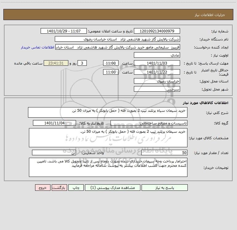 نام دستگاه خریدار:شرکت پالایش گاز شهید هاشمی نژاد استان خراسان رضوی