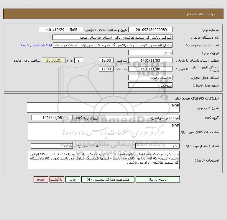 نام دستگاه خریدار:شرکت پالایش گاز شهید هاشمی نژاد استان خراسان رضوی