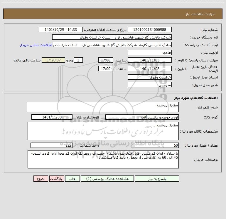 نام دستگاه خریدار:شرکت پالایش گاز شهید هاشمی نژاد استان خراسان رضوی