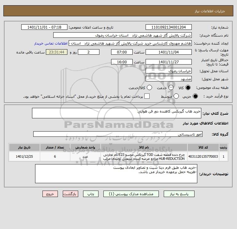 نام دستگاه خریدار:شرکت پالایش گاز شهید هاشمی نژاد استان خراسان رضوی