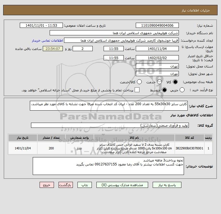 شرح کلی نیاز: کارتن سایز 55x30x30 به تعداد 200 عدد - ایران کد انتخاب شده صرفا جهت تشابه با کالای مورد نظر میباشد.