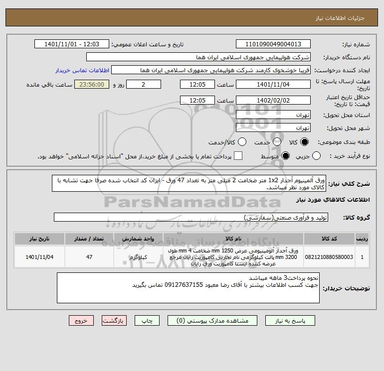شرح کلی نیاز: ورق آلمینیوم آجدار 1x2 متر ضخامت 2 میلی متر به تعداد 47 ورق - ایران کد انتخاب شده صرفا جهت تشابه با کالای مورد نظر میباشد.