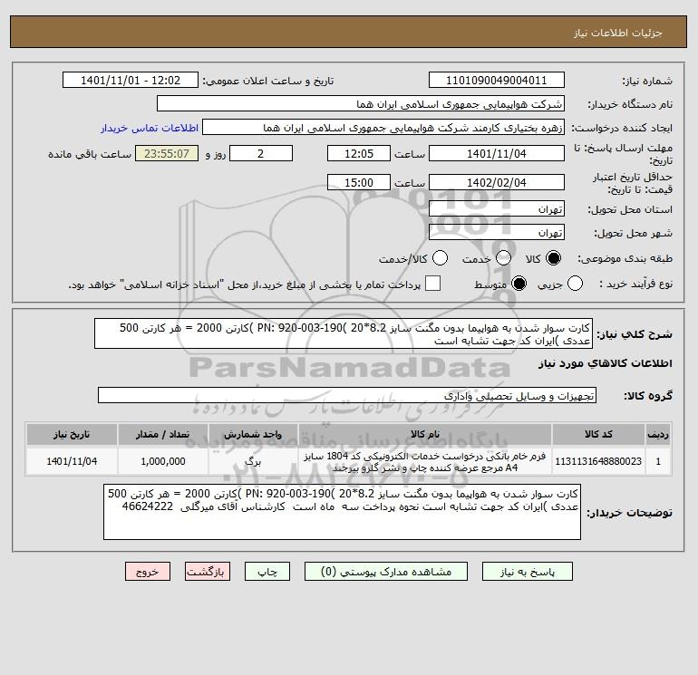 شرح کلی نیاز: کارت سوار شدن به هواپیما بدون مگنت سایز 8.2*20 )190-003-920 :PN )کارتن 2000 = هر کارتن 500 عددی )ایران کد جهت تشابه است