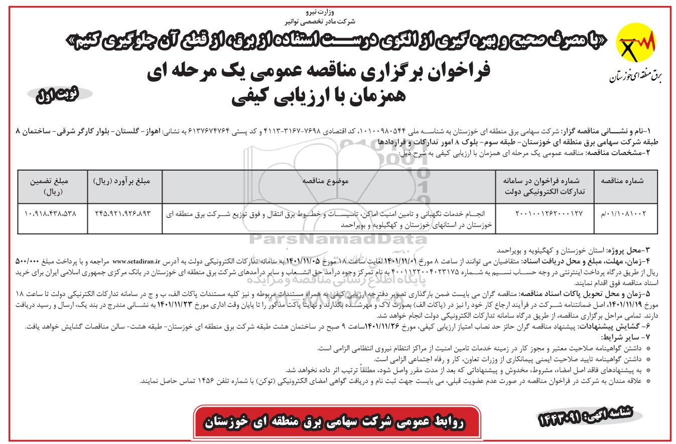 | م/01/1081002 | 2001001262000127 | انجام خدمات نگهبانی و تامین امنیت اماکن، تاسیسات و خطوط برق انتقال و فوق توزیع شرکت برق منطقه ای خوزستان در استان های خوزستان و کهگیلویه و بویراحمد | 245.921.926.893 | 10.918.438.538 |
