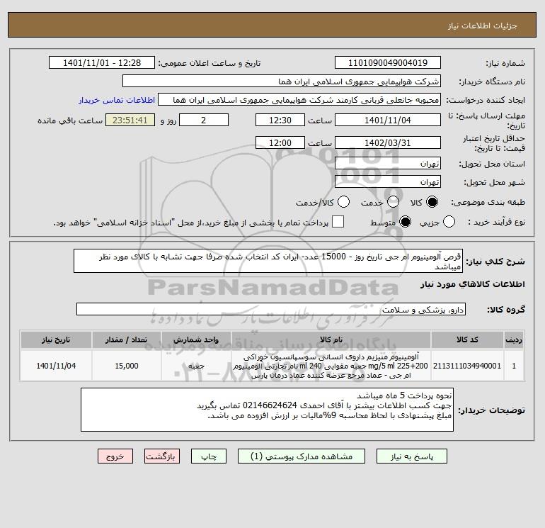 شرح کلی نیاز: قرص آلومینیوم ام جی تاریخ روز - 15000 عدد- ایران کد انتخاب شده صرفا جهت تشابه با کالای مورد نظر میباشد