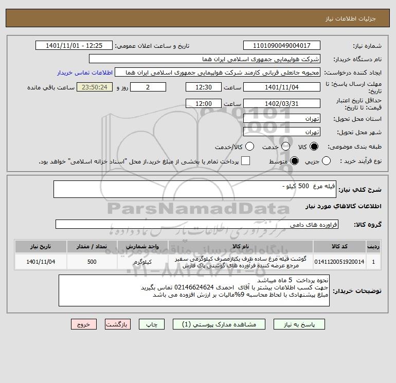 شرح کلی نیاز: فیله مرغ 500 کیلو -