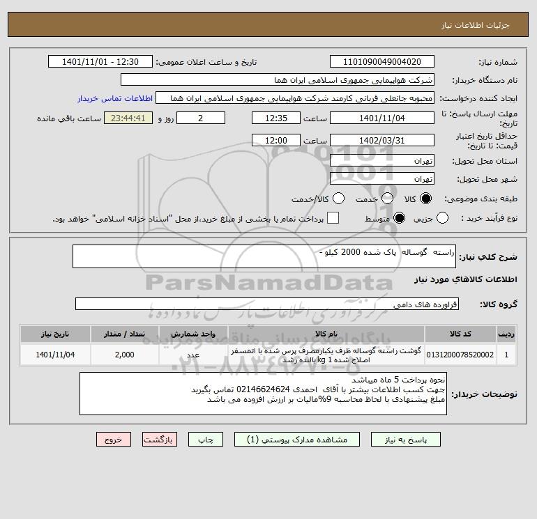 شرح کلی نیاز: راسته گوساله پاک شده 2000 کیلو -
