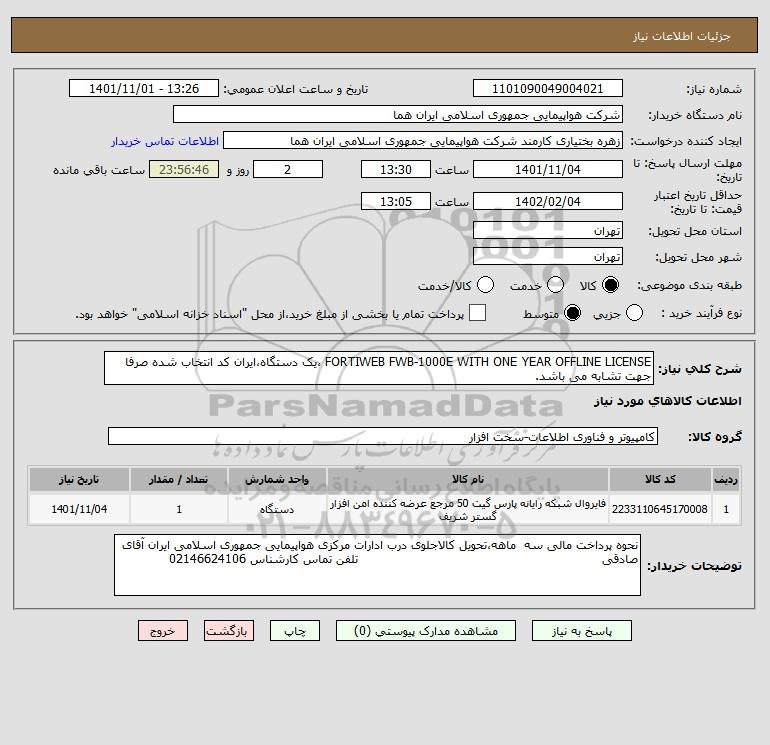 شرح کلی نیاز: FORTIWEB FWB-1000E WITH ONE YEAR OFFLINE LICENSE ،یک دستگاه،ایران کد انتخاب شده صرفا جهت تشابه می باشد.