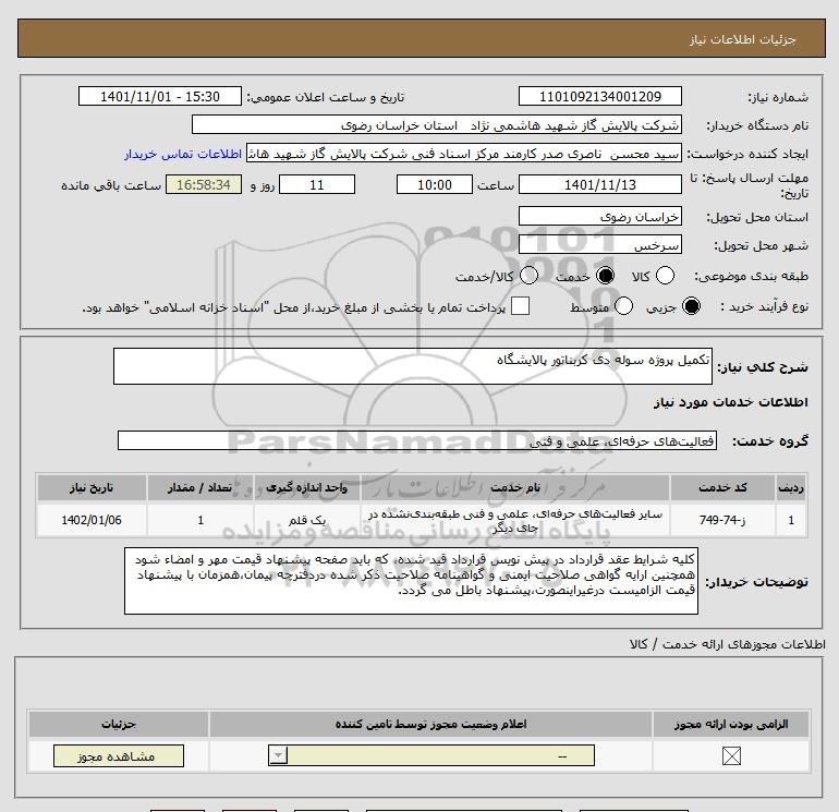 نام دستگاه خریدار:شرکت پالایش گاز شهید هاشمی نژاد استان خراسان رضوی
