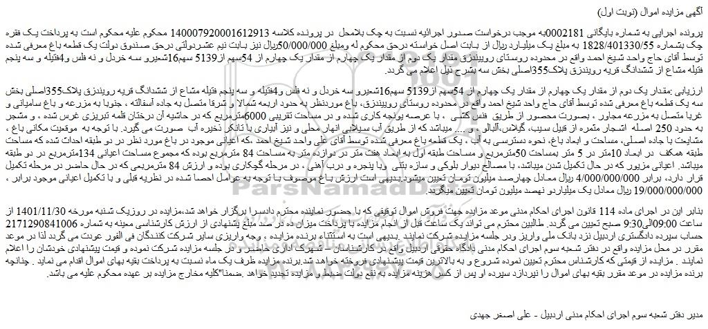 پرونده اجرایی به شماره بایگانی 0002181به موجب درخواست صدور اجرائیه نسبت به چک بلامحل در پرونده کلاسه 140007920001612913 محکوم علیه محکوم است به پرداخت یک فقره چک بشماره 1828/401330/55 به مبلغ یک میلیارد ریال از بابت اصل خواسته درحق محکوم له ومبلغ 50/000/000ریال نیز بابت نیم عشردولتی درحق صندوق دولت یک قطعه باغ معرفی شده توسط آقای حاج واحد شیخ احمد واقع در محدوده روستای روییندزق مقدار یک دوم از مقدار یک چهارم از مقدار یک چهارم از 54سهم از5139 سهم16شعیرو سه خردل و نه فلس و4فتیله و سه پنجم فتیله مشاع از ششدانگ قریه رویندزق پلاک355اصلی بخش سه بشرح ذیل اعلام می گردد.