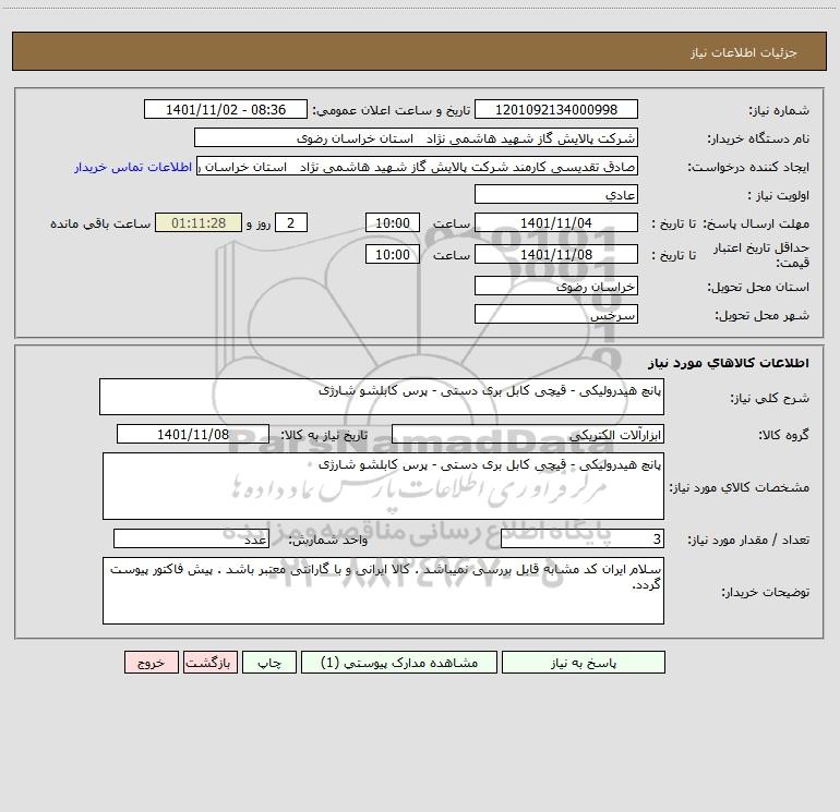 نام دستگاه خریدار:شرکت پالایش گاز شهید هاشمی نژاد استان خراسان رضوی