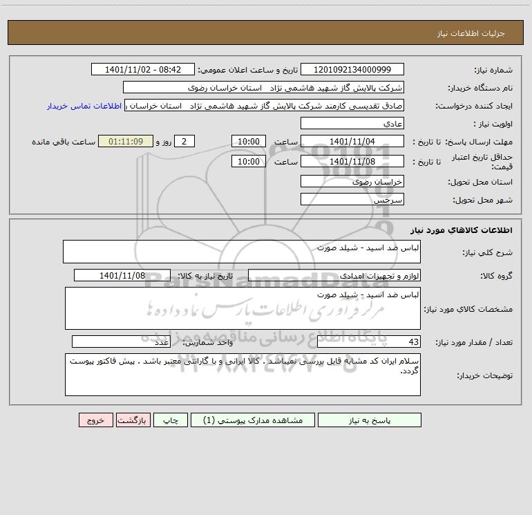 نام دستگاه خریدار:شرکت پالایش گاز شهید هاشمی نژاد استان خراسان رضوی