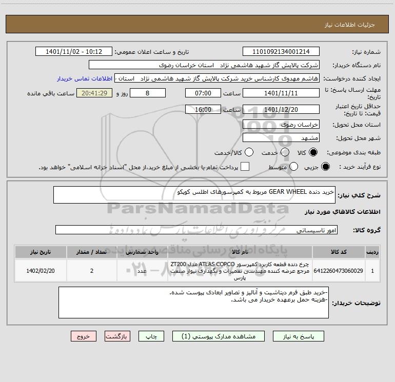 نام دستگاه خریدار:شرکت پالایش گاز شهید هاشمی نژاد استان خراسان رضوی