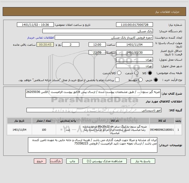 شرح کلی نیاز: ضربه گیر ستون ... / طبق مشخصات پیوست شده / ارسال پیش فاکتور پیوست الزامیست / فکس 26205036