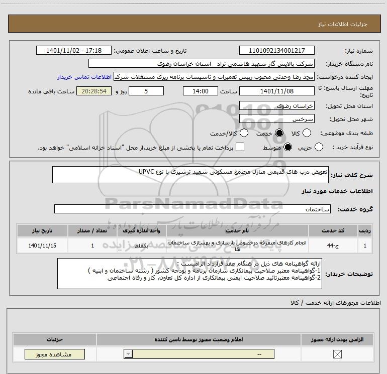 شرح کلی نیاز: تعویض درب های قدیمی منازل مجتمع مسکونی شهید ترشیزی با نوع UPVC