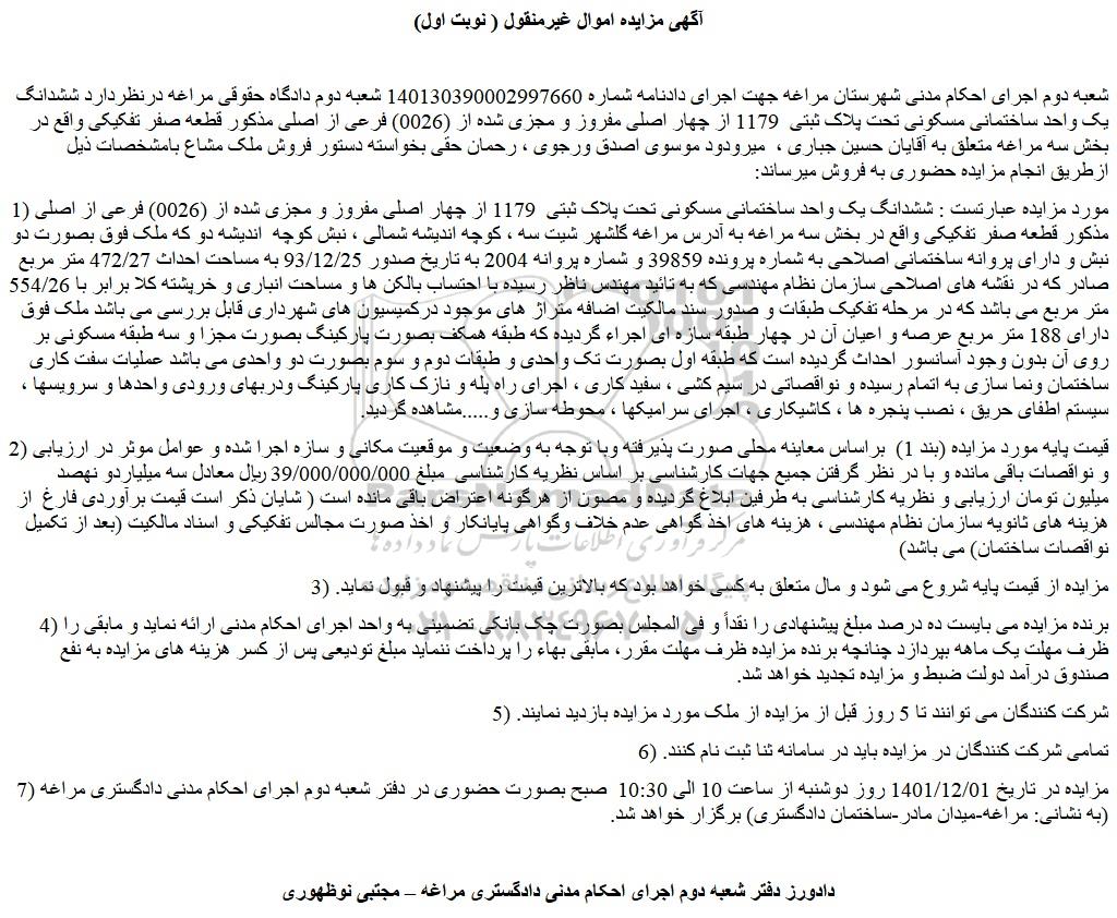 شعبه دوم اجرای احکام مدنی شهرستان مراغه جهت اجرای دادنامه شماره 140130390002997660 شعبه دوم دادگاه حقوقی مراغه درنظردارد ششدانگ یک واحد ساختمانی مسکونی تحت پلاک ثبتی 1179 از چهار اصلی مفروز و مجزی شده از (0026) فرعی از اصلی مذکور قطعه صفر تفکیکی واقع در بخش سه مراغه متعلق به آقایان حسین جباری ، میرودود موسوی اصدق ورجوی ، رحمان حقی بخواسته دستور فروش ملک مشاع بامشخصات ذیل ازطریق انجام مزایده حضوری به فروش میرساند: