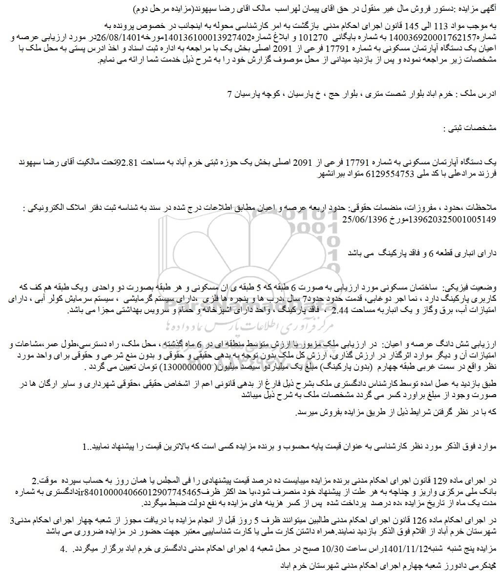 یک دستگاه آپارتمان مسکونی به شماره 17791 فرعی از 2091 اصلی بخش یک حوزه ثبتی خرم آباد به مساحت 92.81تحت مالکیت آقای رضا سپهوند فرزند مرادعلی با کد ملی 6129554753 متواد بیرانشهر