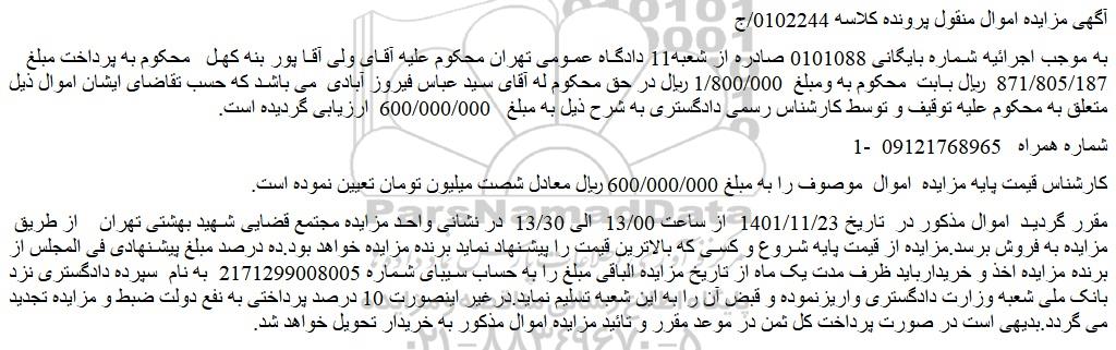به موجب اجرائیه شماره بایگانی 0101088 صادره از شعبه11 دادگاه عمومی تهران محکوم علیه آقای ولی آقا پور بنه کهل محکوم به پرداخت مبلغ 871/805/187 ریال بابت محکوم به ومبلغ 1/800/000 ریال در حق محکوم له آقای سید عباس فیروز آبادی می باشد که حسب تقاضای ایشان اموال ذیل متعلق به محکوم علیه توقیف و توسط کارشناس رسمی دادگستری به شرح ذیل به مبلغ 600/000/000 ارزیابی گردیده است.