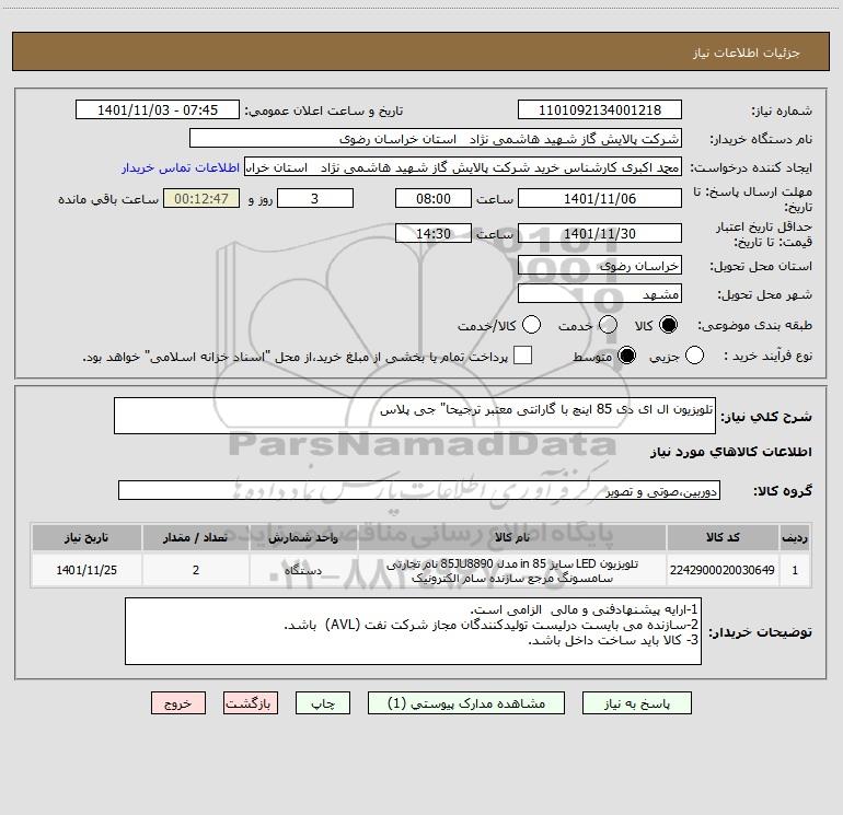 نام دستگاه خریدار:شرکت پالایش گاز شهید هاشمی نژاد استان خراسان رضوی