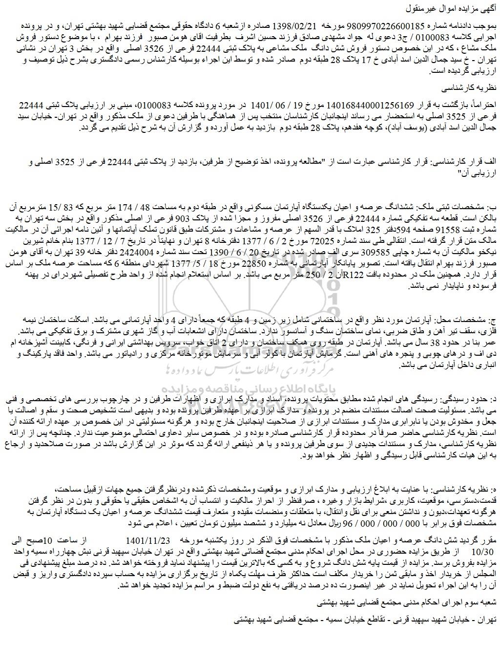 بموجب دادنامه شماره 9809970226600185 مورخه 1398/02/21 صادره ازشعبه 6 دادگاه حقوقی مجتمع قضایی شهید بهشتی تهران، و در پرونده اجرایی کلاسه 0100083 / ج3 دعوی له جواد مشهدی صادق فرزند حسین اشرف بطرفیت اقای هومن صبور فرزند بهرام ، با موضوع دستور فروش ملک مشاع ، که در این خصوص دستور فروش شش دانگ ملک مشاعی به پلاک ثبتی 22444 فرعی از 3526 اصلی واقع در بخش 3 تهران در نشانی تهران - خ سید جمال الدین اسد آبادی خ 17 پلاک 28 طبقه دوم صادر شده و توسط این اجراء بوسیله کارشناس رسمی دادگستری بشرح ذیل توصیف و ارزیابی گردیده است.