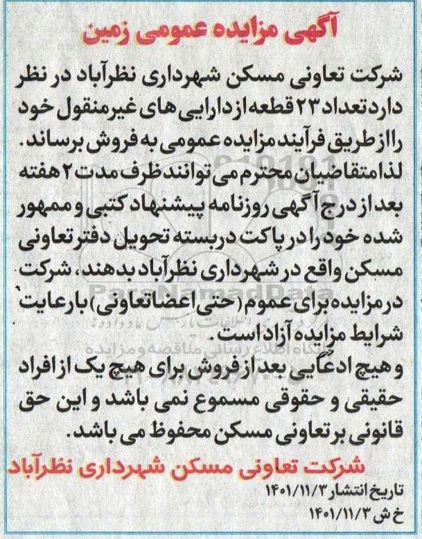 شرکت تعاونی مسکن شهرداری نظرآباد در نظر دارد تعداد 23 قطعه از دارایی های غیر منقول خود را از طریق فرآیند مزایده عمومی به فروش برساند.