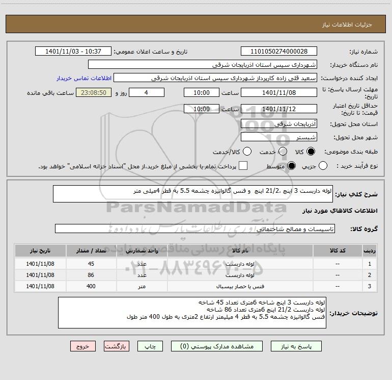شرح کلی نیاز: لوله داربست 3 اینچ ،21/2 اینچ و فنس گالوانیزه چشمه 5.5 به قطر 4میلی متر