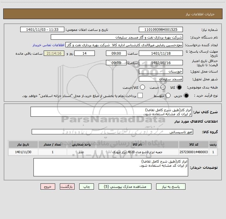 توضیحات خریدار:ابزار کار(طبق شرح کامل تقاضا) از ایران کد مشابه استفاده شود.