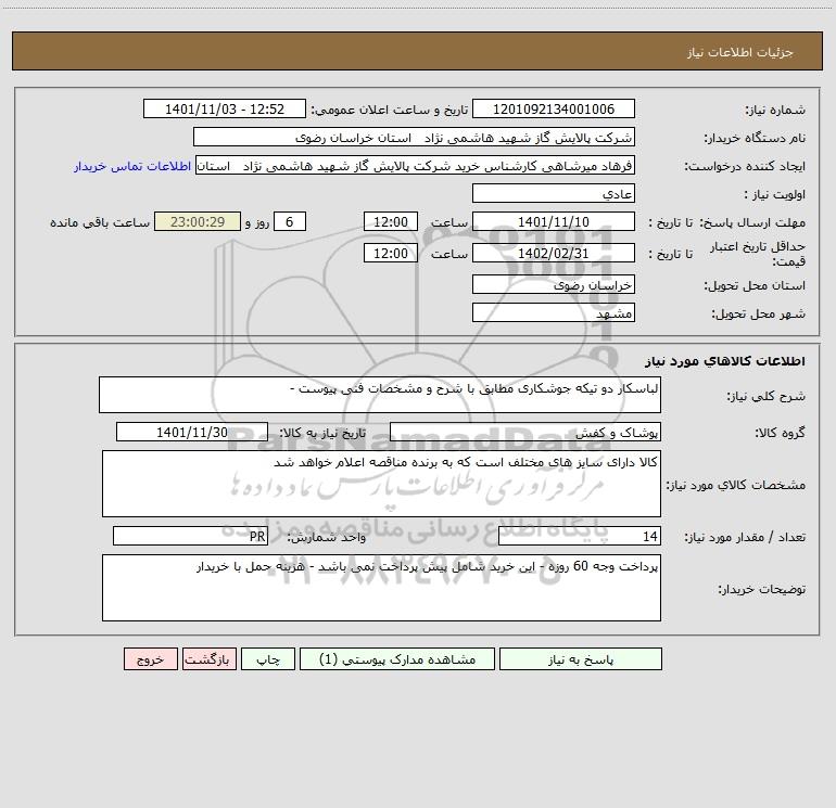 نام دستگاه خریدار:شرکت پالایش گاز شهید هاشمی نژاد استان خراسان رضوی