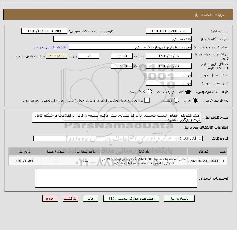 استعلام اقلام الکتریکی مطابق لیست پیوست. ایران کد مشابه. پیش فاکتور ضمیمه را کامل با اطلاعات فروشگاه کامل کرده و بارگزاری نمایید., استعلام اقلام الکتریکی مطابق لیست پیوست. ایران کد مشابه. پیش فاکتور ضمیمه را کامل با اطلاعات فروشگاه کامل کرده و بارگزاری نمایید.