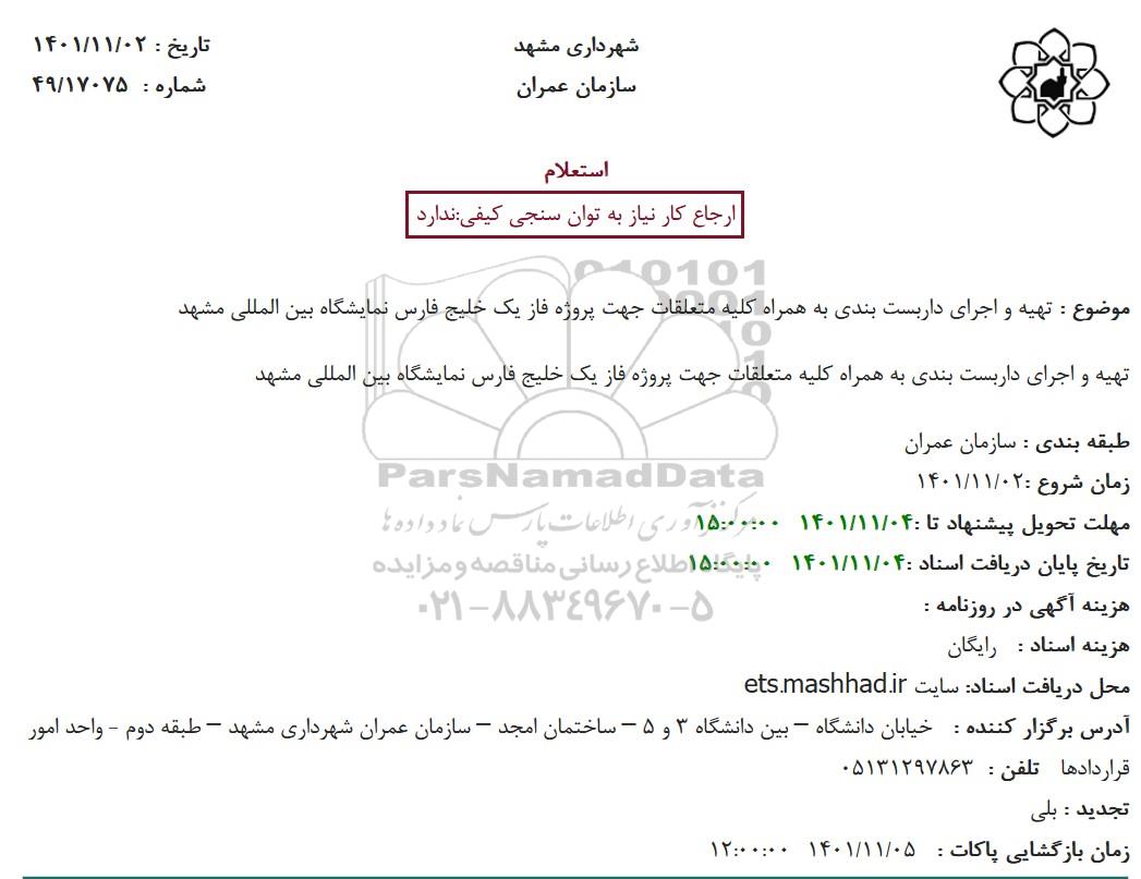 موضوع : تهیه و اجرای داربست بندی به همراه کلیه متعلقات جهت پروژه فاز یک خلیج فارس نمایشگاه بین المللی مشهد