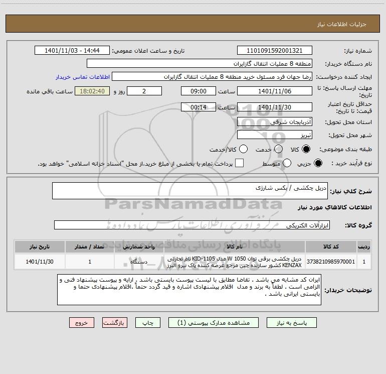 | 1 | 3738210985970001 | دریل چکشی برقی توان 1050 W مدل KID-1105 نام تجارتی KENZAX کشور سازنده چین مرجع عرضه کننده پاک نیرو البرز | دستگاه | 1 | 1401/11/30 |