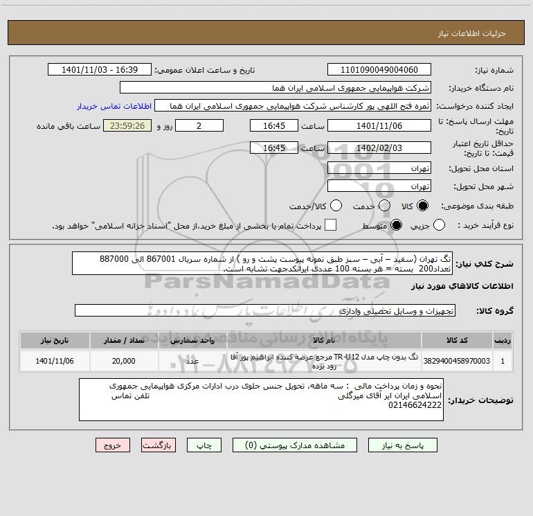 شرح کلی نیاز: تگ تهران (سفید – آبی – سبز طبق نمونه پیوست پشت و رو ) از شماره سریال 867001 الی 887000 تعداد200 بسته = هر بسته 100 عددی ایرانکدجهت تشابه است.